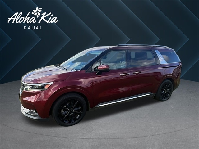 Certified. Flare Red 2023 Kia Carnival SX Prestige FWD 8-Speed Automatic 12 Speakers, 3.51 Axle Ratio, 3rd row seats: split-bench, 4-Wheel Disc Brakes, ABS brakes, Air Conditioning, Alloy wheels, AM/FM radio: SiriusXM, Apple CarPlay & Android Auto, Auto High-beam Headlights, Auto-dimming Rear-View mirror, Automatic temperature control, Brake assist, Bumpers: body-color, Compass, Delay-off headlights, Driver door bin, Driver vanity mirror, Driver's Seat Integrated Memory System, Dual front impact airbags, Dual front side impact airbags, Electronic Stability Control, Emergency communication system, Exterior Parking Camera Rear, Four wheel independent suspension, Front anti-roll bar, Front Bucket Seats, Front Center Armrest, Front dual zone A/C, Front fog lights, Front reading lights, Fully automatic headlights, Garage door transmitter: HomeLink, Heated & Ventilated Front Bucket Seats, Heated door mirrors, Heated front seats, Heated steering wheel, Illuminated entry, Knee airbag, Leather Seat Trim, Leather Shift Knob, Leather steering wheel, Low tire pressure warning, Memory seat, Navigation System, Occupant sensing airbag, Outside temperature display, Overhead airbag, Overhead console, Panic alarm, Passenger door bin, Passenger vanity mirror, Power 2nd-Row Moonroof, Power door mirrors, Power driver seat, Power Liftgate, Power moonroof, Power passenger seat, Power steering, Power windows, Radio: AM/FM/HD Audio System, Rear air conditioning, Rear anti-roll bar, Rear reading lights, Rear Seat Entertainment Package, Rear window defroster, Rear window wiper, Reclining 3rd row seat, Remote keyless entry, Roof rack: rails only, Security system, Speed control, Speed-sensing steering, Split folding rear seat, Spoiler, Steering wheel mounted audio controls, Tachometer, Telescoping steering wheel, Tilt steering wheel, Traction control, Trip computer, Turn signal indicator mirrors, Variably intermittent wipers, Ventilated front seats, Wheels: 7.5J x 19" Black Painted Alloy. V6