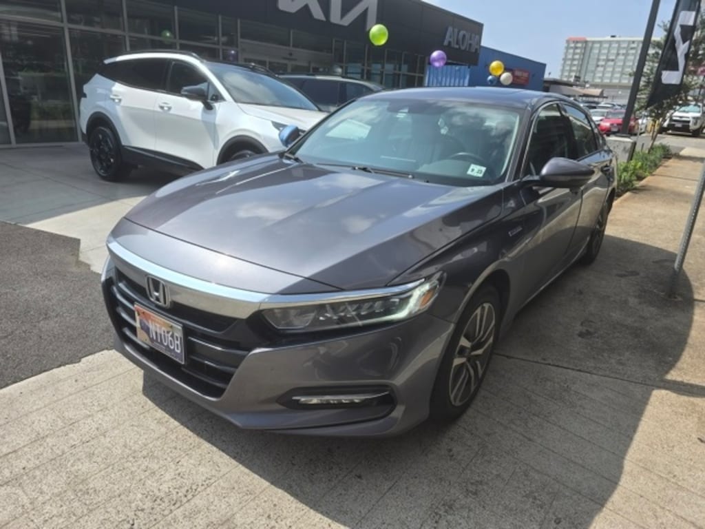 Gray 2018 Honda Accord Hybrid EX-L w/Navigation FWD eCVT 2.0L 4-Cylinder DOHC 16V i-VTEC 2.0L 4-Cylinder DOHC 16V i-VTEC, 10 Speakers, 17" Machine-Finished Alloy Wheels, 4-Wheel Disc Brakes, ABS brakes, Air Conditioning, Alloy wheels, AM/FM radio: SiriusXM, Apple CarPlay/Android Auto, Auto High-beam Headlights, Auto-dimming Rear-View mirror, Automatic temperature control, Blind Spot Information (BSI) System warning, Brake assist, Bumpers: body-color, Delay-off headlights, Driver door bin, Driver vanity mirror, Dual front impact airbags, Dual front side impact airbags, Electronic Stability Control, Emergency communication system: HondaLink, Exterior Parking Camera Rear, Four wheel independent suspension, Front anti-roll bar, Front Bucket Seats, Front Center Armrest, Front dual zone A/C, Front fog lights, Front reading lights, Fully automatic headlights, Garage door transmitter: HomeLink, Heated door mirrors, Heated Front Bucket Seats, Heated front seats, Illuminated entry, Knee airbag, Leather steering wheel, Leather-Trimmed Seats, Low tire pressure warning, Memory seat, Navigation System, Occupant sensing airbag, Outside temperature display, Overhead airbag, Overhead console, Panic alarm, Passenger door bin, Passenger vanity mirror, Power door mirrors, Power driver seat, Power moonroof, Power passenger seat, Power steering, Power windows, Radio data system, Radio: 450-Watt AM/FM/HD Premium Audio System, Rear anti-roll bar, Rear seat center armrest, Rear window defroster, Remote keyless entry, Security system, Speed control, Speed-sensing steering, Speed-Sensitive Wipers, Split folding rear seat, Steering wheel mounted audio controls, Telescoping steering wheel, Tilt steering wheel, Traction control, Trip computer, Turn signal indicator mirrors, Variably intermittent wipers, Backup Camera / Reverse Camera / Rear View Camera, 2.0L 4-Cylinder DOHC 16V i-VTEC, 10 Speakers, 17" Machine-Finished Alloy Wheels, 4-Wheel Disc Brakes, ABS brakes, Air Conditioning, Alloy wheels, AM/FM radio: SiriusXM, Apple CarPlay/Android Auto, Auto High-beam Headlights, Auto-dimming Rear-View mirror, Automatic temperature control, Blind Spot Information (BSI) System warning, Brake assist, Bumpers: body-color, Delay-off headlights, Driver door bin, Driver vanity mirror, Dual front impact airbags, Dual front side impact airbags, Electronic Stability Control, Emergency communication system: HondaLink, Exterior Parking Camera Rear, Four wheel independent suspension, Front anti-roll bar, Front Bucket Seats, Front Center Armrest, Front dual zone A/C, Front fog lights, Front reading lights, Fully automatic headlights, Garage door transmitter: HomeLink, Heated door mirrors, Heated Front Bucket Seats, Heated front seats, Illuminated entry, Knee airbag, Leather steering wheel, Leather-Trimmed Seats, Low tire pressure warning, Memory seat, Navigation System, Occupant sensing airbag, Outside temperature display, Overhead airbag, Overhead console, Panic alarm, Passenger door bin, Passenger vanity mirror, Power door mirrors, Power driver seat, Power moonroof, Power passenger seat, Power steering, Power windows, Radio data system, Radio: 450-Watt AM/FM/HD Premium Audio System, Rear anti-roll bar, Rear seat center armrest, Rear window defroster, Remote keyless entry, Security system, Speed control, Speed-sensing steering, Speed-Sensitive Wipers, Split folding rear seat, Steering wheel mounted audio controls, Telescoping steering wheel, Tilt steering wheel, Traction control, Trip computer, Turn signal indicator mirrors, Variably intermittent wipers.